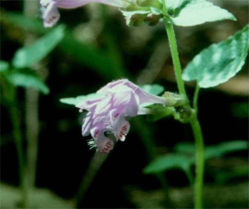 ちょうど咲き出しの頃で、まわりには蕾の株も見られる。ラショウモンカズラの名は京の羅生門の鬼から来ているそうだが、山の芽吹きに囲まれていると想像は難しい。 (2007.04)